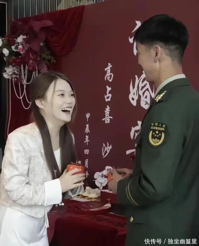 在亲戚朋友的祝福声中,高占喜给女友戴上了亮闪闪的订婚戒指。
